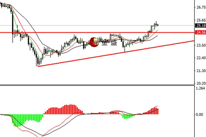 前一个交易日,白银走势与现货黄金趋同,日内震荡上行,价格冲上25美元上方,全收涨超5%,力度明显大于黄金。今天日内多头维持强势状态,白银最大涨幅超1.5%,价格触及25.5美元一线出现承压信号。均线系统多头排列,MACD指标零轴附近运行,做多的动能为主,行情突破低位的上升三角形结构,操作上回调低吸为主。