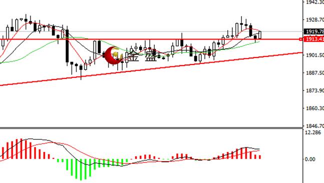 前一个交易日,美指持续走低,盘中打破多个支撑位,刺激黄金全天震荡上行,晚间最高至1931一带,日图收阳线。今天早盘行情有所回落,价格调整至1910一线止跌,此处也是最近一波上涨的50%位置,午后美指承压92.8下行,黄金收复日内部分失地。均线系统拐头向上呈现多头排列结构,MACD指标零轴附近现金叉,做多的动能减弱,四小时图,行情突破近一周的上升三角形整理结构,今天早盘做回踩确认,操作上低吸为主。