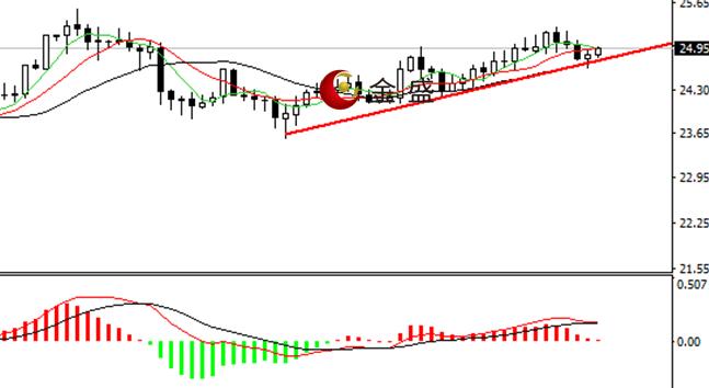 前一个交易日,白银与黄金走势同步,但力度上强于黄金,盘中最大涨幅超1.5%,价格最高至25.3美元附近。今天早盘深度回落,价格一度调整至24.6一带,也是昨日最低点附近,此处正好是图示的趋势线,随后有所企稳反抽。均线系统拐头向上,MACD指标现金叉,做多的动能减弱,操作上做多为主。