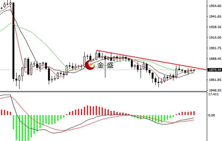 前一个交易日,黄金在晚间出现强势上冲,价格上探1880一带,正好打到图示的压力线有所调整,短期多头动能有所增强。今天日内,行情围绕不足十美金区间整理,均线系统收敛,运行在1875下方,MACD指标零轴下方现金叉,做多的动能增强,日内关注图示压力线的真假突破,1885一带压力明显,操作上偏向高抛为主,1870下方支撑明显,出现企稳信号可以博多。