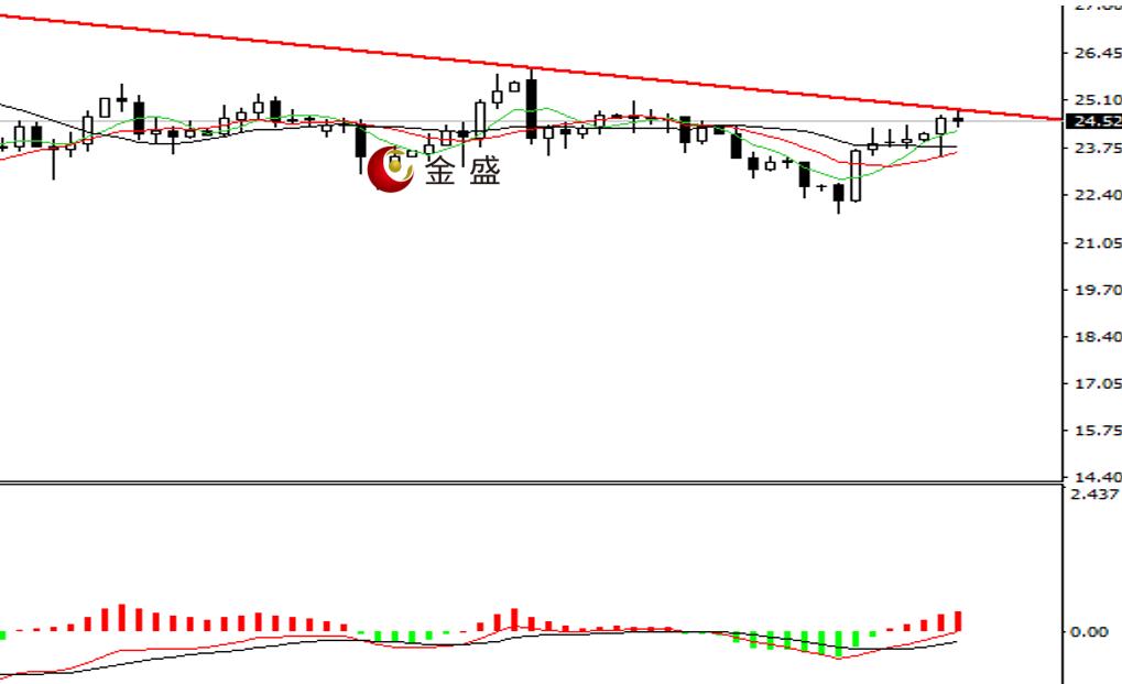 前一个交易日,亚盘时段,银价依托24关口震荡,午后银价跟随黄金跳水,价格回落至区间下轨23.5美元形成日内低点,晚间白银强势拉升,银价快速打破区间上轨,最高至24.8美元,日图收阳线。均线系统逐渐收敛,价格运行在其上方,MACD快慢线零轴一带现金叉,做多的动能继续放大,行情向上突破三日的盘整区间,短期面临图示的压力线,银价或回踩之前的区间上轨,操作上回调低吸为主。