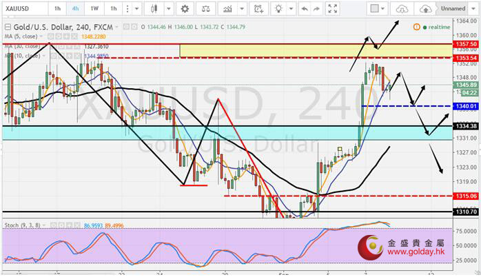 国际现货黄金周三(9月7日)亚盘和欧盘维持高位窄幅震荡走势,达到1354美元/盎司一线没有进行进一步上行,上行动能减弱,随后美盘开始出现明显回落。关注上方阻力1355美元/盎司附近,突破1358美元/盎司后可进一步看多,突破不了要注意回踩。下方回踩关注1340和1334-1330美元/盎司,若获得支撑,可以做多,其中1340需要首次触及做多。