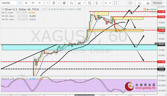 现货白银周三(9月7日)亚盘和欧盘基本维持高位小幅震荡走势,后出现小幅回落,美盘小幅反抽后加速下行。上方关注阻力20.00美元/盎司附近,突破看20.20和20.40美元/盎司,突破不了做空,下方关注19.78-19.70区间的支撑,下破看19.50美元/盎司一线附近,支撑住反抽20整数关口附近做空。