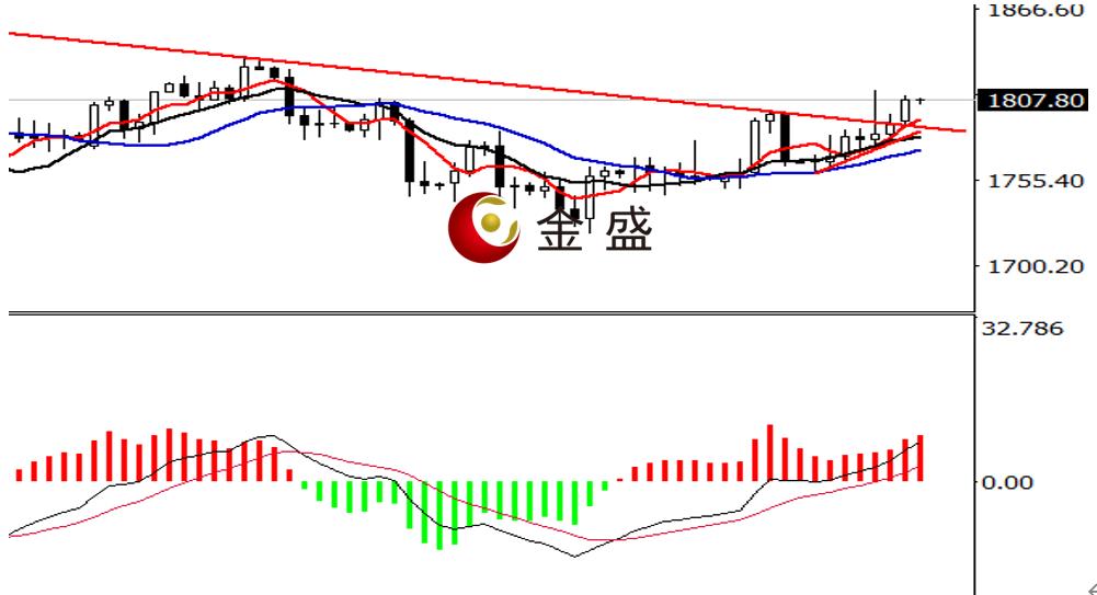 前一个交易日,白盘时段,黄金开市即形成当日低点1792美元,随后缓慢爬升,价格在千八一线整理数小时。晚间多头一小时上冲八美金,价格在1810附近形成日内高点,随后陷入窄幅休整,日图收中阳线。均线系统不断收敛,价格运行在均线上方。MACD指标零轴附近运行,做多的动能增强。上周五大阴线之后未出现二次回踩,而是持续上行。价格暂时跳出下行趋势线的压制,且上周五大阴线的空头动能大部分被消化。行情震荡偏强,操作上回调做多为主。