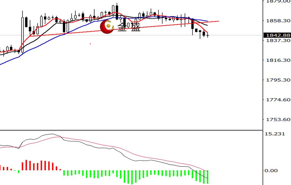前一个交易日,欧盘时段市场出现避险情绪,美指、黄金出现同涨现象。晚间避险情绪减弱,美联储官员表示十二月份加快缩债是合适的,黄金跳水跌破头肩顶颈线,价格失守1850关口。今天日内行情反弹无力,价格运行在1850关口下方。均线系统拐头向下。MACD指标零轴上方现死叉,快慢线回落至零轴一带,做空的动能为主。四小时级别,技术形态呈现圆弧顶结构,价格还未止跌企稳。日内1840下方出现连续下影线,表明多头蠢蠢欲动,故而下行空间有限,操作上高抛低吸。