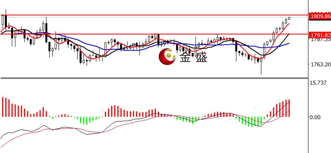 前一个交易日,美国Markit制造业PMI创近一年新低,欧洲央行在最新决议上维持维持三大关键利率不变,重申明年不太可能加息。美指延续调整再次收阴,黄金持续上涨,全天拉升超二十美金,涨幅超1%。今天日内金价涨势不减,价格突破千八关口。均线系统拐头向上。MACD指标零轴附近现金叉,做多的动能为主。四小时图,自1753的上行呈现连阳模式,双底的颈线已经突破,表明多头力度强劲,但短期目前已经反弹超五十美金,注意冲高回落风险,操作上回调低吸为主。