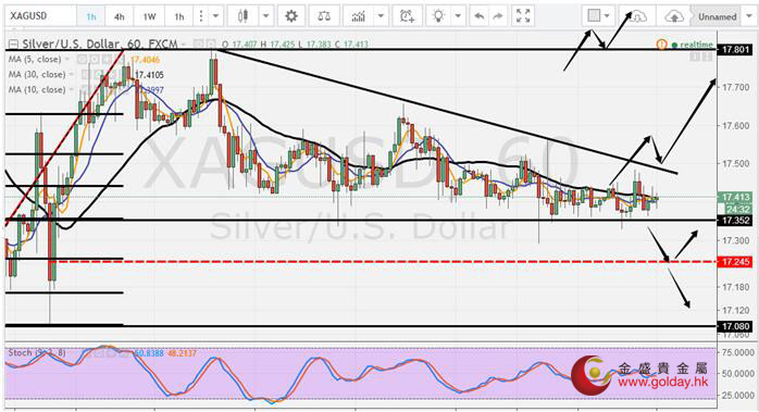 国际现货白银周一(10月17日)亚盘和欧盘延续低位震荡,美盘震荡幅度收窄,总体趋势未破。下方关注17.35美元/盎司的支撑,获得支撑进场做多,第一目先看上方下行趋势线。下破17.35多单离场,下破反抽不破可以做空。稳健的可以等白银上破三角形上方趋势线后进场多单。