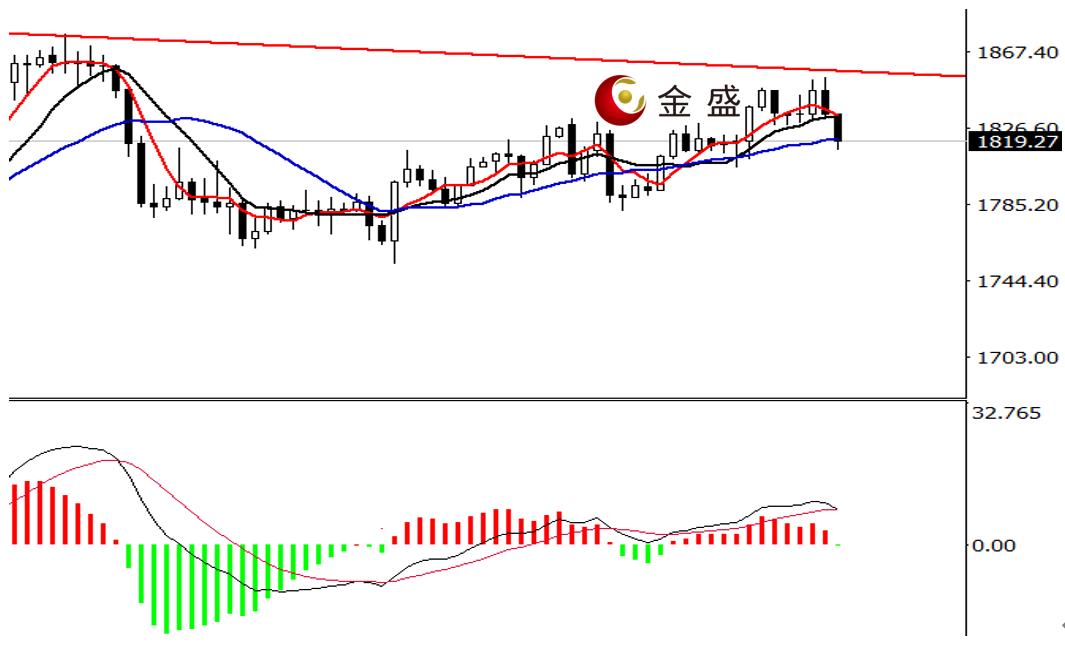前一个交易日,白盘时段,黄金开市即形成当日高点1849.87美元,随后震荡走低,但波动不超过十美金。晚盘时段,金价连续阴线下挫,利率决议公布后,价格加速走低,盘中打破多个整数关口,最低至1814美元,日图收饱满中大阴线。,均线系统不断收敛,价格回落至布林带中轨。MACD指标零轴上方运行,做多的动能衰竭。目前价格还未止跌企稳,凌晨利空消息偏向继续发酵,操作上反弹做空为主。
