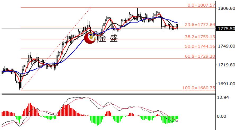 前一个交易日,美国三季度经济增速预期再次下调,美元冲高至107关口承压回吐当日全部涨幅。黄金围绕区间窄幅整理,日内波动才十美金左右,盘中反弹力度偏弱,表明连续两日调整多头依然弱势。今天白盘行情再次上冲至1780美元一线承压拐头下行。均线系统空头排列,布林带中轨运行在价格上方。MACD指标快慢线零轴上方出现死叉,做空的动能为主。行情周一大跌,周二窄幅休整,多头反弹力度偏弱。下方关键支撑看1760一线,此处是前一波上涨段黄金分割位的38.2%,也在日图布林带中轨附近。操作上反弹做空为主,支撑位出现止跌企稳信号博多。
