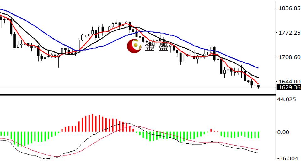 前一个交易日,亚盘时段,黄金开市即形成当日低点1622美元,随后持续反弹。午后价格在1640一线受阻横盘整理。晚盘时段,行情向下打破日内高位整理,回吐日内部分涨幅,盘中最高点1642美元,日图收有上影线的阳K。均线系统空头排列,短期均线压制价格反弹。MACD指标零轴下方运行,做空的动能增强。近两日形成孕线结构,但反弹力度依然较弱,五日均线逐渐下移,操作上反弹做空为主。