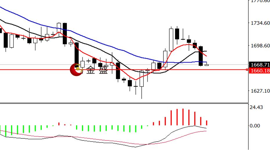 前一个交易日,早盘黄金高开短暂上行至1698.06美元,形成当日高点,随后拐头连续阴线走低。晚盘时段,行情跌势不减,价格一小时下挫超十美金,盘中最低至1665.56美元,日图收饱满中阴线。均线系统不断收敛,价格击穿布林带中轨。MACD指标零轴下方运行,做多的动能减弱。黄金四日调整,昨日的下行力度相比之前明显增强,盘中无反弹动能,前一波日线反弹的空间回吐过半。今天白盘关注1660一线的真假破位。