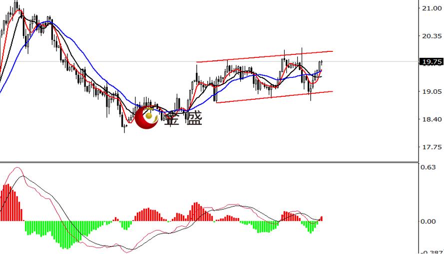 前一个交易日,银价白盘跌晚盘涨走V字型结构,19美元关口失而复得,最终收涨近1%。今天白盘行情延续反弹,价格再次回到近期盘整结构上轨。均线系统不断收敛,价格运行在布林带中轨上方。MACD指标零轴附近现金叉,做空的动能为主。金银走势出现分化,白银维持震荡偏强的结构,价格在图示的通道内整理近十日,短期面临变盘选择。未突破前,围绕18.8—20区间高抛低吸。