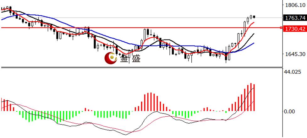 前一个交易日,白盘时段,美指反弹无力延续下挫,黄金企稳1750美元关口震荡上行。欧美盘时段,行情大部分时间围绕十美金区间整理,尾盘价格向上突破区间,创当日高点1772.58美元,日图收阳线。均线系统多头排列,价格企稳五周期均线。MACD指标快慢线零轴下方现金叉,做多的动能为主。黄金日图两连阳,自非农以来上涨空间近一百五十美金,短期涨幅过大,不建议追涨。1730一线突破后还未回踩确认,操作上等待回踩博多。
