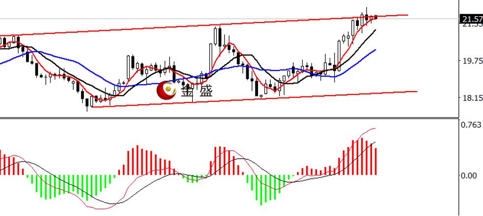 前一个交易日,白盘时段,行情延续涨势,一小时拉升0.4美金,创当日高点22.05美金,午后拐头回吐早盘全部涨幅。晚盘时段,价格调整至21.25美元形成当日低点,随后有所反弹,最终收十字星。均线系统多头排列,支撑价格走高。MACD指标零轴上方运行,做多的动能减弱。白银依然围绕通道上轨整理,价格在小时图出现滞涨,22美元关口形成有效压力位,短期行情偏向震荡,操作上高抛低吸。