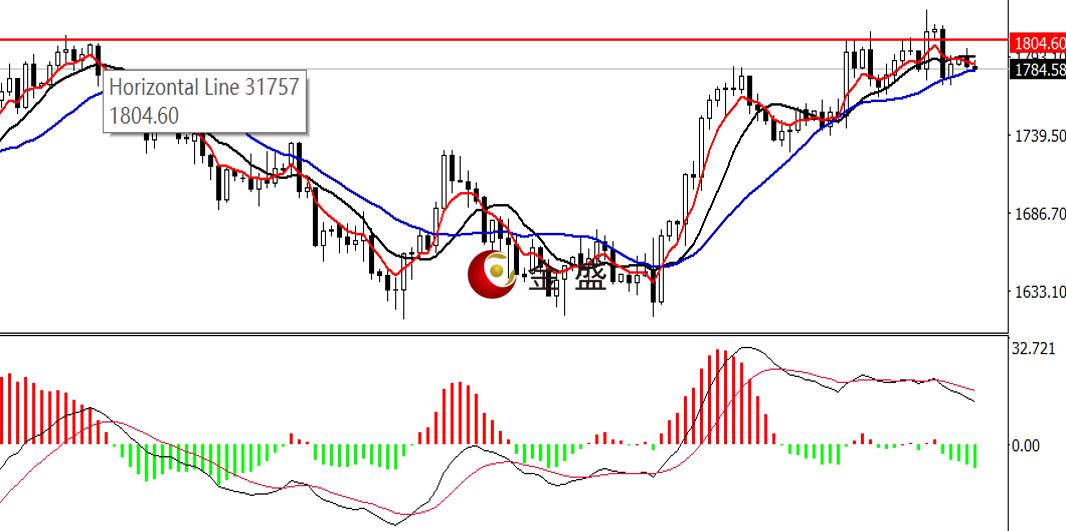 前一个交易日,白盘时段,行情企稳1790美元一带震荡上行,午后创当日高点1798.47美元。晚盘时段,行情拐头下行,回吐白盘全部涨幅,尾盘创当日低点1783.71美元,日图收阴线。均线系统不断收敛,价格回落至布林带中轨附近。MACD指标快慢线在零轴上方现死叉,做空的动能有所增强。价格依托日图布林带中轨震荡三天,昨日反弹高度不及千八一带,即还未触及头肩顶的右肩一带,行情可能要延续调整,操作上反弹做空为主。