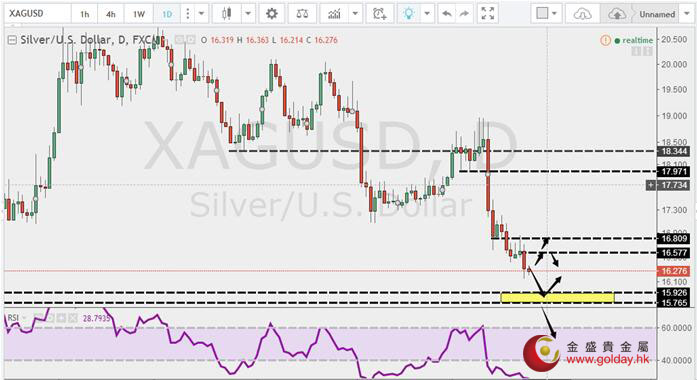 国际现货白银周三(11月23日)亚盘和欧盘基本维持低位震荡的走势,总体并无什么改变,美盘出现大量卖单,价格出现了大幅的回落,目前没有止跌起稳的迹象。上方关注16.80和16.58美元/盎司的阻力,下方依然关注15.92-15.75美元/盎司区间的支撑。暂时不着急做多,下破16.20,基本上没看出有大量的买单。