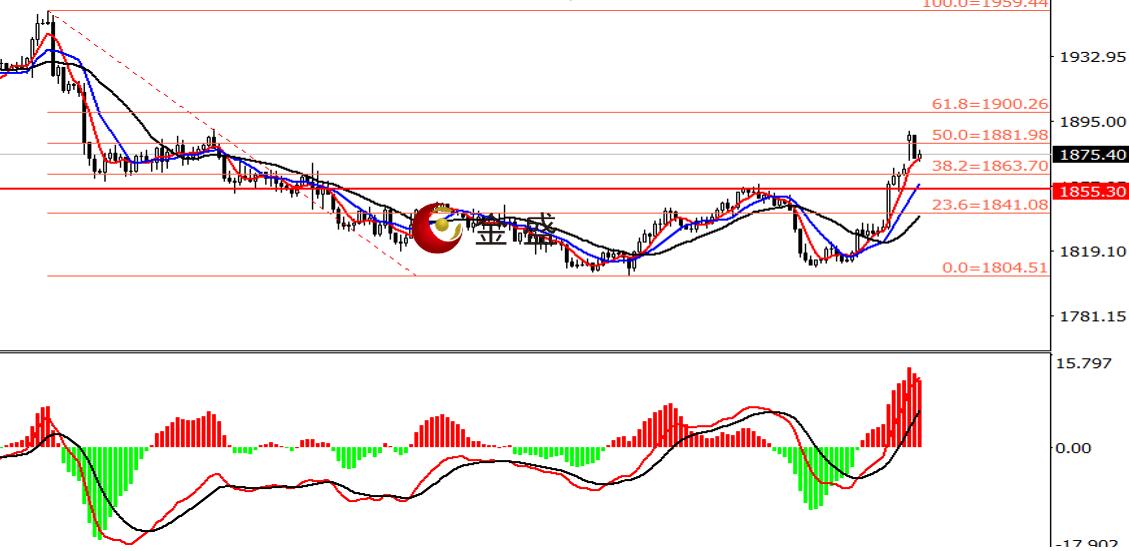前一个交易日,非农数据好坏参半,叠加硅谷银行崩盘引发的避险情绪,市场对美联储3月加息50个基点的预期有所降温。黄黄金强势上行逾四十美金,价格接连打破多个整数关口,日图收涨近2%。今天白盘行情延续涨势,价格高开高走至1890美元一线。四小时级别,均线系统多头排列,支撑价格上行。MACD指标快慢线零轴下方现金叉,做多的动能为主。行情向上打破低位上涨通道,确认四小时级别的下跌趋势结束,短期走势偏向震荡上行。前一波下跌段的黄金分割位61.8%位于1900美元一带,此处是后市关键压力位,操作上回调做多为主。