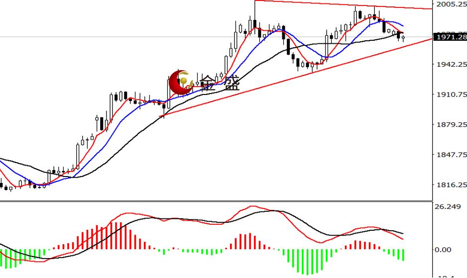 前一个交易日,美国三月服务业和制造业PMI回升,美指连续反弹两日冲上103关口,黄金先涨后跌走倒V字型,价格再次受阻两千大关口,当日波动近三十美金。今天白盘行情延续调整,价格逼近1960美元一线。四小时级别,均线系统不断收敛,运行在价格上方。MACD指标快慢线零轴上方现死叉,做空的动能增强。黄金跌破上涨趋势线,上周五反弹至趋势线附近承压回落。两千一带压力明显,短期关注行情是否围绕图示的收敛三角形震荡,操作高抛低吸。