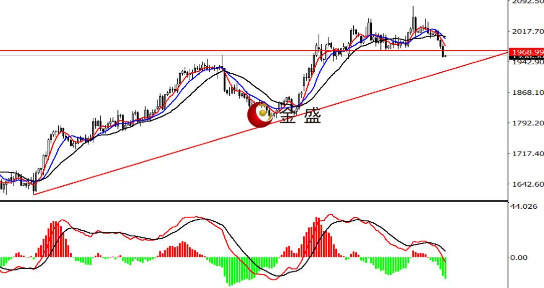前一个交易日,白盘时段,行情短暂上行创日内高点1985.75美元,随后拐头连续阴线下挫跌破周三低点。晚盘时段,空头力度再度增强,行情延续跌势,金价跌破1970美元一线后出现加速下挫,盘中最低至1951.84美元,日图收阴线。均线系统拐头向下,压制价格反弹。MACD指标快慢线零轴上方现死叉,做空的动能增强。昨日价格跌破高位震荡区间,下行空间进一步打开,下方强支撑位看图示的趋势线一带。昨日大幅下挫,今天或有反抽,操作上反弹做空为主。