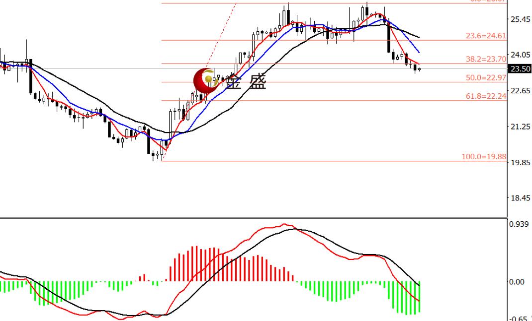 前一个交易日,白盘时段,行情承压23.8美元震荡下行,午后价格刷新周三低点,价格跌至23.4美元一带略有反弹。晚盘时段,行情波动率降低,多空围绕0.2美金的空间博弈,日图收阴线。均线系统拐头向下,五日均线压制价格反扑。MACD指标快慢线零轴上方现死叉,做空的动能为主。白银延续调整,昨日阴线反包周三的十字星,多空平衡被打破,空头力度占优。下一个黄金分割位看图示的23美元一线,操作上反弹做空为主。