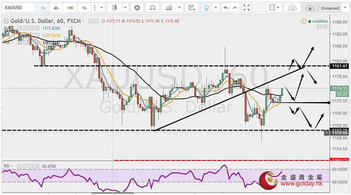 国际现货黄金周一(12月5日)亚盘冲高回落,欧盘延续回落走势,加速下行,美盘触底反弹,最低点下破1160美元/盎司。上方关注1181美元/盎司和趋势线是否能够实体突破,反抽不破可以做空,下方关注1170和1160美元/盎司两线的支撑,获得支撑可以做多,下破则有继续下行空间。