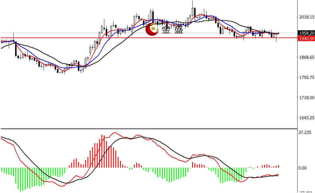 前一个交易日,白盘时段,黄金延续下行,价格跌破周内整理区间下轨1940美元关口,午后多头尝试反扑,但持续性欠佳。晚盘时段,行情探底1925美元止跌转涨,盘中一小时拉升逾二十美金,收复白盘全部跌幅,尾盘创当日高点1960美元,日图收下影线较长的阳K。均线系统不断收敛走平,价格围绕其震荡。MACD指标快慢线零轴下方运行,做多的动能有增强的迹象。昨日黄金向下确认假突破,行情维持震荡格局。空头向下尝试突破失败,后市偏向震荡上行测试上轨1980美元一带压力,操作上回调做多为主。