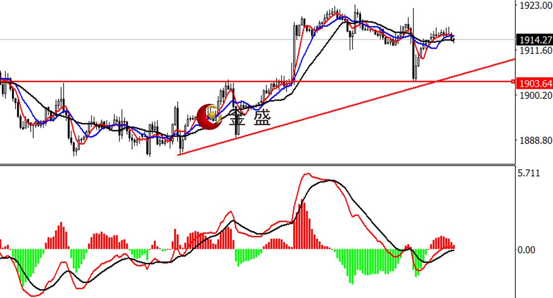前一个交易日,鲍威尔暗示可能还要加息,美指一小时拉升七十点创当周新高,黄金承压下挫近二十美金,价格逼近千九关口,尾盘反弹收窄日内跌幅。今天白盘黄金企稳1910美元上方震荡,行情波动不大。小时级别,均线系统不断收敛,价格围绕其震荡。MACD指标快慢线零轴下方运行,做多的动能减弱。黄金反弹形成图示的上行趋势线,上周五价格回落至支撑线附近出现反抽,小时级别的上行趋势未被破坏。短线行情偏向围绕1900—1920区间震荡,操作上围绕区间高抛低吸。