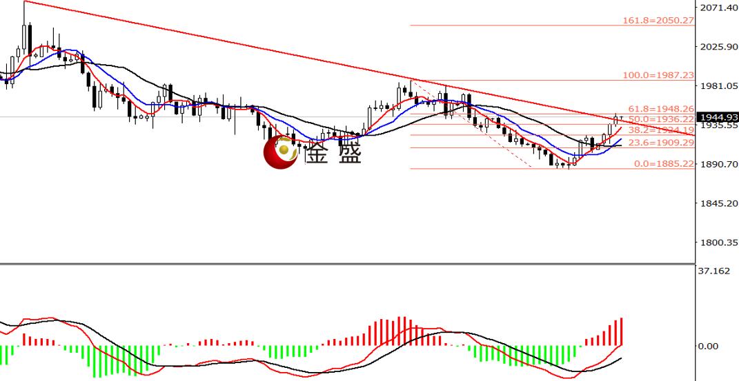 前一个交易日,白盘时段,黄金窄幅横盘整理,价格创日内低点1934.8美元,午后拐头上行。晚盘时段,行情延续涨势,价格一小时拉升近十美金,盘中最高至1948.79美元,尾盘略有回吐,日图收有上影线的阳K。均线系统拐头向上,价格站稳布林带中轨。MACD指标快慢线零轴下方现金叉,做多的动能为主。黄金周内连续三日收阳,价格刺破图示的下降压力线,收复前一个波段大部分跌幅。昨日K线有上影线,表明上行压力渐强,但价格还未出现反转信号,操作上回调做多为主,1950美元上方出现反转信号博空。