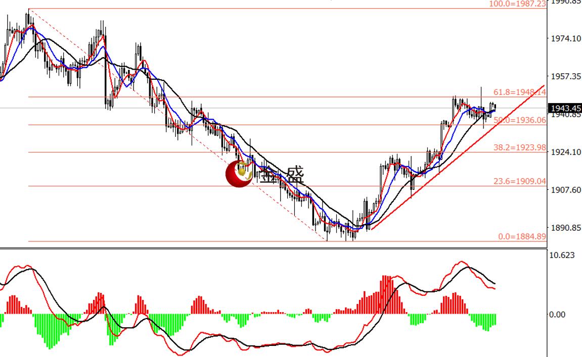 现货黄金周一(9月4日)开市于1939.36美元/盎司,亚欧盘时段,美指震荡调整至104关口;黄金依托上周五的低点继续反弹,午后承压回吐日内部分涨幅。截止目前,金价最高1946.06美元/盎司,最低1939.35美元/盎司。四小时周期,黄金上行趋势未改变,价格依然运行在支撑线上方,但多头再次受阻黄金分割压力位1950美元关口,多空围绕此处整理三天, K线出现阴包阳反转信号,后市偏向震荡下行,短线或区间盘整,操作上高抛为主。今日美国迎来假期,金银提前休市,行情波动或不大。