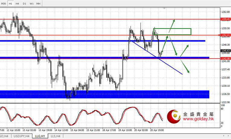 国际现货黄金周三(4月20日)昨日欧盘维持震荡走势,亚盘、美盘均有冲高表现,但冲高回落,导致日线级别连收两根长上影线。就小时级别看来,高点基本持平,但是低点是在不断降低的。关注上方1252.50美元/盎司附近,可以考虑在该位置适当开空。下方仍要重点关注1240-1242支撑区间的表现,若1240失守,下方暂看1234-1230.由于今日欧洲央行利率决议在即,在此前黄金交投可能会略显谨慎,或蓄力待发。