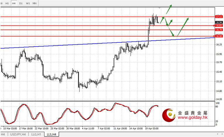 国际现货白银周三(4月20日)昨日亚盘和欧盘也是两次冲高回落,日线收出双针探顶形态,恐短期要有所回落。上方重点关注17.10美元/盎司附近,不破轻仓空,下方关注16.85美元/盎司一线的支撑表现,下破之后,会有进一步回落的空间,下破回抽不破就空单进场。下方要重点关注周线级别16.50美元/盎司附近的支撑表现。