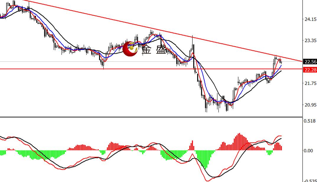 前一个交易日,白银走势与黄金类似,因受地缘政治局势影响,银价全天持续拉升,价格逼近23美元大关,最终收涨4%。今天白盘行情承压图示的压力线有所调整,但回调力度有限。四小时级别,均线系统多头排列,对价格反弹形成支撑。MACD指标快慢线零轴上方运行,做多的动能减弱。白银下行趋势未改变,但反弹力度有所增强。短期关注趋势线一带的真假突破,操作上回调做多为主。