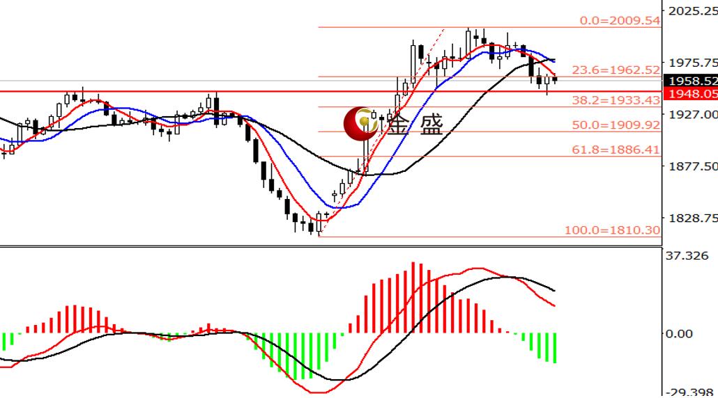前一个交易日,白盘时段,黄金多头维持弱势,行情围绕1950美元关口上下五美金整理,但价格重心偏下移。午后创日内低点1944.67美元。晚盘时段,行情探底回升,盘中一小时拉升逾十美金,价格最高至1965.32美元。尾盘美指大幅走高,黄金回吐部分涨幅,日图收阳线。均线系统不断收敛拐头向下,布林带中轨压制价格反弹。MACD指标快慢线零轴上方现死叉,做空的动能增强。黄金在V型底水平口1950美元一带出现反弹,结束日图连阴调整。K线还未形成止跌企稳信号,短线或再次回踩前低确认支撑的有效性。1970美元一带的压力位与布林带中轨共振,行情或进入区间震荡,操作上高抛低吸。