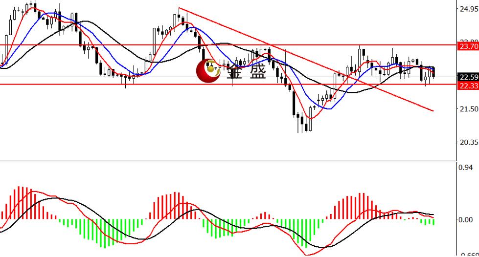 前一个交易日,白盘时段,银价震荡下行,多头回吐周三大部分涨幅,午后窄幅横盘震荡,价格创日内低点22.34美元。晚盘时段,多头强势反扑,价格连续走高至23美元一带,尾盘跟随黄金调整,回吐日内全部涨幅,日图收十字星。均线系统不断收敛,运行在价格上方形成阻碍。MACD指标快慢线在零轴上方现死叉,做空的动能增强。白银头肩底雏形未被破坏,行情围绕左右肩与颈线之间震荡多日,等待市场自身走出方向,操作上在未突破前,围绕区间高抛低吸。