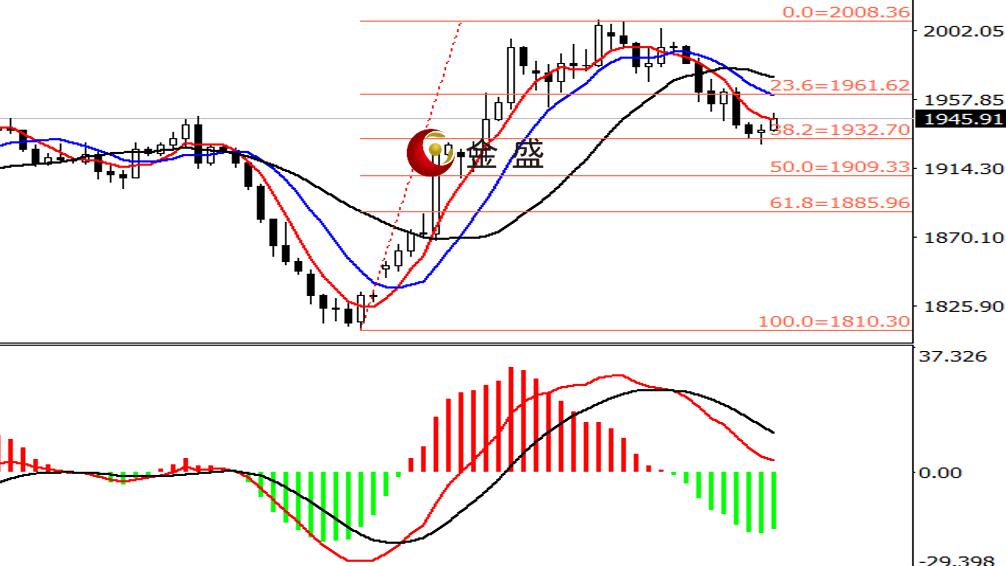 前一个交易日,白盘时段,黄金开市一小时波动逾十美金,价格创日内低点1929.85美元,随后进入五美金内的横盘震荡。晚盘时段,行情再次回踩早盘低点止跌回升,价格拉升近二十美金,盘中最高至1949美元,日图收阳线。均线系统不断收敛拐头向下,五日均线压制价格反弹。MACD指标快慢线零轴上方现死叉,做空的动能为主。黄金调整至图示的黄金分割线38.2%一带有所反抽,收复上周五一半的失地,但日图K线依然无止跌信号,后市还需二次确认1930美元一带支撑的有效性,操作上高抛为主,低吸为辅。