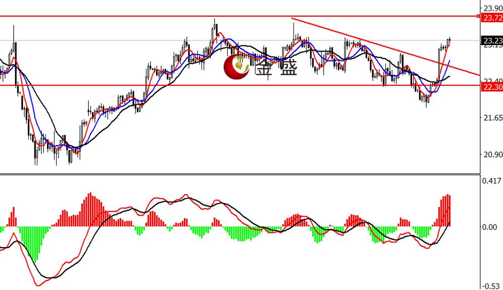 前一个交易日,白银走势与黄金同步,但上行力度更强,价格重回23美元关口,最终收涨3.51%。今天白盘银价横盘数小时后再度上行,继续刷新周内新高。四小时级别,均线系统收敛向上拐头,对价格上行构成支撑。MACD指标快慢线零轴下方现金叉,做多的动能增强。昨日白银强势突破下降三角形的上轨,即确认向下打破22.4—23.7美元的盘整区间未果,后市将寻求向上突围。短期关注区间上轨压力,操作上低吸为主。