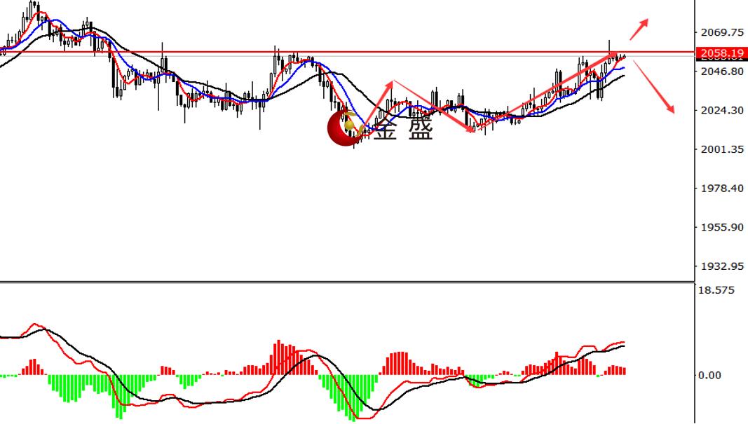 前一个交易日,美国1月ISM制造业超预期,上周初请失业金人数意外上升。美指承压前高走低至103关口,黄金美盘前震荡下行,晚间强势反转大幅走高至2060美元一带,当日波动逾三十美金,最终收涨0.76%。今天白盘行情以休整为主,价格波动不大。四小时周期,均线系统拐头向上,在价格下方形成支撑。MACD指标快慢线零轴上方运行,做多的动能为主。昨日黄金回踩2030美元关口出现大幅拉升,ABC反弹结结构还未终结。技术形态类似圆弧底,昨日高点2060美元一带是多空分水岭,突破则反弹高度进一步打开;反之则偏向震荡调整。晚间公布非农数据,行情波动或加大,操作上关注2060美元一带的真假破位。