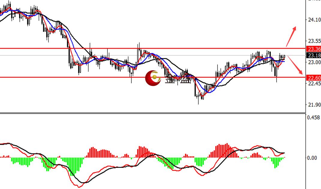 前一个交易日,白银走势与黄金同步,行情先跌后涨上演V型反转,多头重新收复23美元关口,最终收涨1.04%。今天白盘行情波动不大,价格围绕昨日高点窄幅休整。四小时级别,均线系统收敛走平,对价格反弹形成支撑。MACD指标快慢线现零轴上方运行,做空的动能衰竭。白银低位震荡形成图示的头肩底结构,昨日回踩左肩22.6美元一带,出现强势反抽,确认其支撑有效。短期关注颈线23.3美元一带的真假突破,操作上未突破前围绕结构高抛低吸。