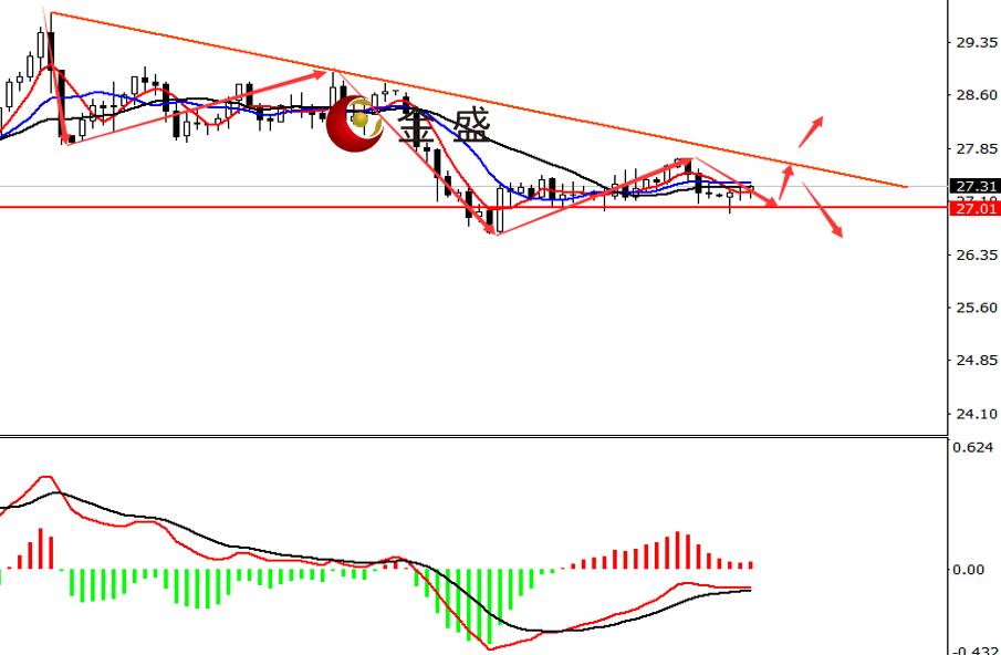 前一个交易日,白银走势与黄金同步,盘中一度突破盘整区间,但多头力度偏弱,价格先涨后跌走倒V字型,最终收跌0.80%。今天早盘价格快速下探至27美元关口有反弹,小时图收止跌锤子线,午后震荡上行。四小时级别,均线系统收敛走平,价格围绕其震荡。MACD指标快慢线零轴下方运行,做多的动能减弱。白银形成下行趋势,价格运行在压力线下方。上周的反弹结构还未被破坏,27美元一带是多空分水岭,操作上反弹做空为主。
