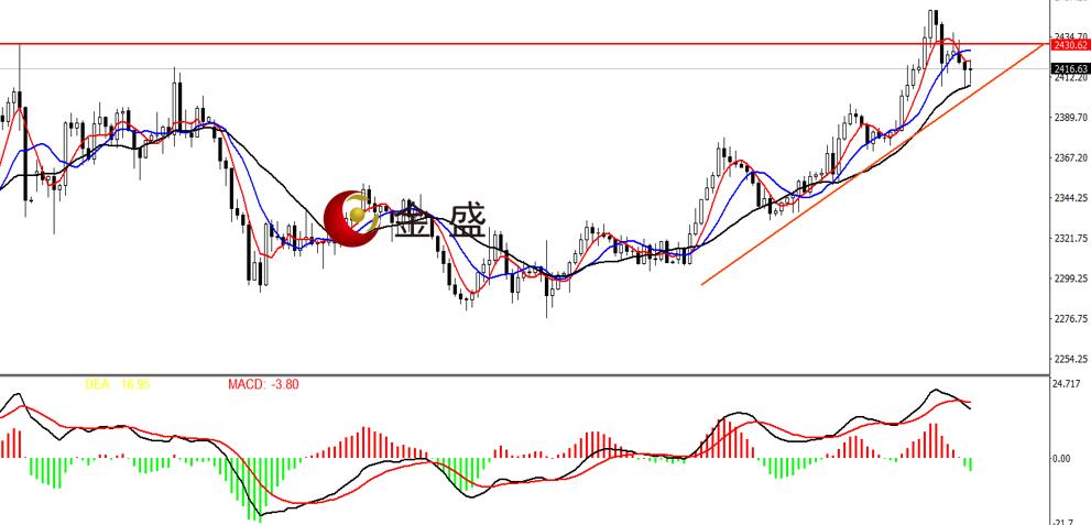 前一个交易日,美指围绕五日均线休整,价格重心小幅上移,最终收小阳。黄金早盘拉升至历史新高2450美元一带,随后震荡下行,当日波动逾四十美金,最终收涨0.48%。今天白盘行情昨日的结构内整理,价格二次回踩2410美元一带有反抽。四小时周期,均线系统不断收敛,布林带中轨运行在价格下方形成支撑。MACD指标快慢线零轴上方现死叉,做空的动能有为主。黄金上行趋势不变,前高2430美元一带确认假突破,即压力位有效,这暂时限制价格上行的空间。下方2410美元一带是多维度的支撑位,不能有效跌破,则行情偏向休整蓄势,操作上调整做多为主。