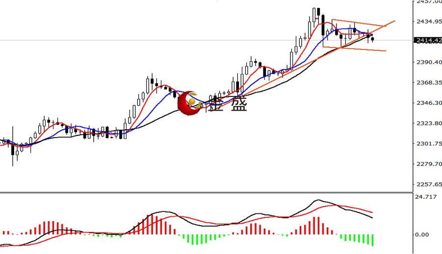 现货黄金周三(5月22日)开市于2420.86美元/盎司,亚欧盘时段,美指围绕小时图布林带中轨整理,日内波动十多个点。黄金延续昨日的结构内震荡,价格运行在2410美元上方。截止目前,金价最高2426.21美元/盎司,最低2411.48美元/盎司。四小时周期,黄金上行趋势不变,价格高位盘整逾两日,高低点有所下移,调整走势形成下行通道。今天午后价格跌破加速趋势线,短期多头动能有减弱。K线靠近昨日低点还未出现止跌迹象,日内或测试2400美元一带的支撑,操作上调整做多为主。