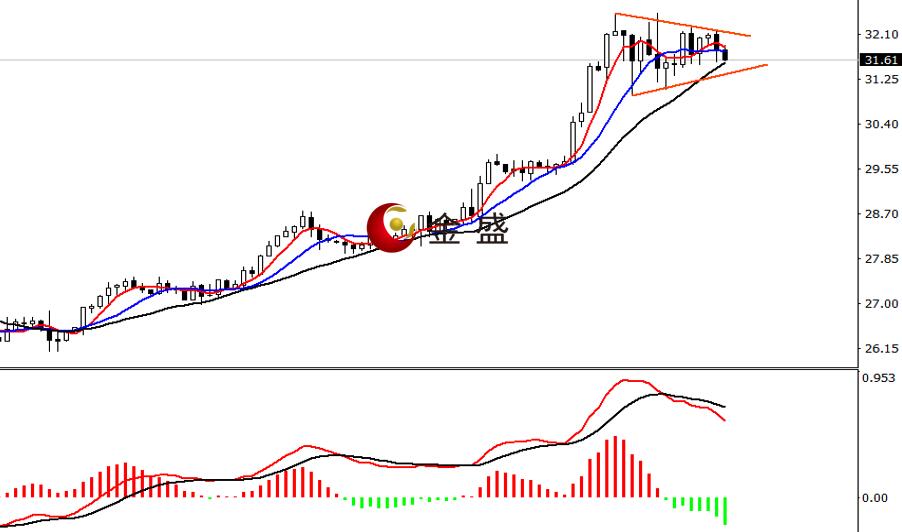 前一个交易日,白银涨势减缓,行情进入高位盘整,价格坚守31美元关口,最终收涨0.63%。今天白盘行情延续高位区间震荡,价格失守32美元关口。四小时级别,均线系统不断收敛,布林带中轨对价格形成支撑。MACD指标快慢线零轴上方现死叉,做空的动能增强,指标继续调整。白银上涨趋势不变,短期进入盘整蓄势,价格高位震荡形成图示的收敛三角形结构,31美元关口是多头关键支撑位,操作上回调做多为主。