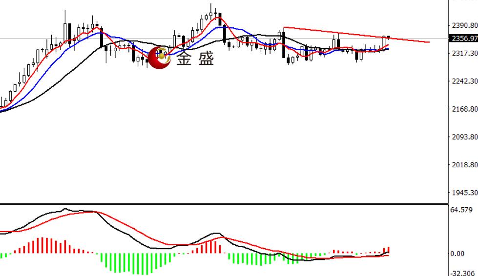前一个交易日,白盘时段,行情短暂调整至日内低点2326.82美元,午后强势突破近期盘整区间,价格站上2340美元关口。晚盘时段,美国经济数据疲软,美指跳水,黄金进一步扩大涨幅,价格接连打破多个关口,盘中最高至2364.68美元,日图收中阳线。均线系统收敛走平,运行在价格下方构成支撑。MACD指标快慢线零轴附近现金叉,做多的动能有所增强。黄金突破前两日的盘整,确认反弹空间打开。目前价格来到图示的压力线附近,但K线未出现明显受阻迹象,2370美元一带是强压力, 操作上高抛低吸。