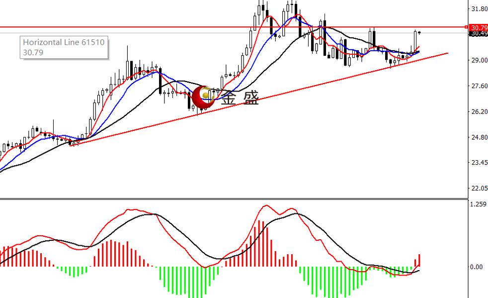前一个交易日,白盘时段,行情依托29.5美元关口短暂横盘,午后拐头震荡上行,价格冲上30美元大关。晚盘时段,行情涨势不减,价格进一步上涨,盘中最高至30.65美元,日图收中阳线。均线系统收敛走平,对价格形成支撑。MACD指标快慢线附近现金叉,做多的动能增强。白银连续五日上涨,昨日K线实体最大,表明市场看涨意愿强化。行情上涨趋势不变,技术形态是双底结构,颈线位于30.8美元一带,短期关注真假突破,操作上调整做多为主。