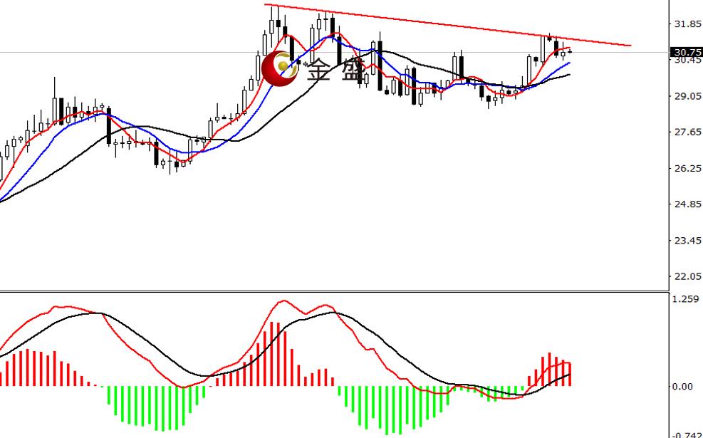前一个交易日,白盘时段,行情震荡上行为主,价格重新站上31美元关口,随后进入横盘整理。晚盘时段,行情拐头下行,盘中一小时下挫0.4美金,价格调整至日内低点30.5美元关口止跌回升,日图收有影线的阳星。均线系统拐头向上,对价格形成支撑。MACD指标快慢线附近现金叉,做多的动能增强。白银高点形成图示的压力线,价格进入上涨后的休整,上涨结构还未改变,K线未出现反转信号,操作上回调做多为主。