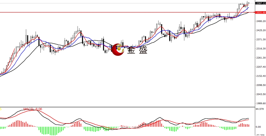 前一个交易日,白盘时段,黄金短暂调整形成当日低点2551.21美元,随后持续阳线上涨,盘中突破多个整数关口。午后创日内高点2594.62美元。晚盘时段,行情走V字型,价格一小时回落近二十美金,尾盘回到日内高点附近,日图收中阳线。均线系统多头排列,价格坚守五周期均线。MACD指标快慢线零轴上方现金叉,做多的动能减弱。黄金利率决议之后走V字型,近两日K线实体阳包阴,即降息落地后,盘面并未出现持续调整,反而出现止跌信号,后市继续创新高的概率较大。
