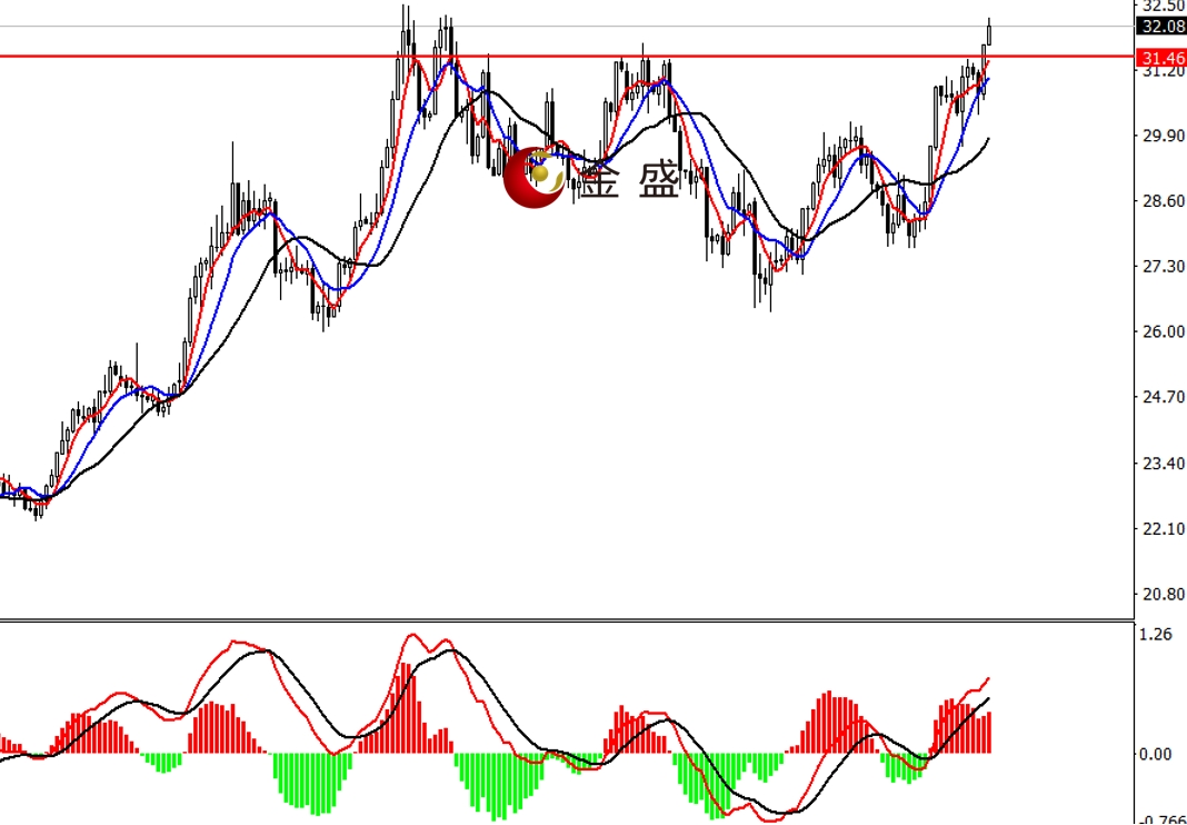 前一个交易日,白银表现与黄金类似,白盘窄幅整理,晚盘强势爆发,价格冲上32美元大关,最终收涨4.58%。今天白盘行情承压昨日高点震荡偏下行,多头回吐昨日小部分涨幅,价格失守32美元关口。四小时级别,均线系统多头排列,对价格上涨形成支撑。MACD指标快慢线上方现金叉,做多的动能增强。白银自27.7美元开始的上行趋势不变,多头向上打破近期盘整结构,确认趋势延续,上行空间被打开。操作上回调做多为主。