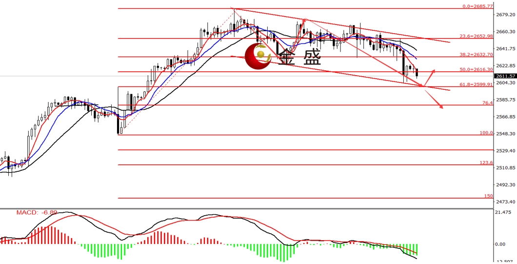 前一个交易日,真主党首次公开支持在黎巴嫩停火,美指延续窄幅休整收十字星。中东地缘局势有所降温,黄金震荡下行,晚间跌破盘整区间加速走低,价格逼近2600美元关口,当日波动近五十美金,最终收跌0.79%。今天白盘行情维持弱势状态,多头回吐昨日尾盘大部分涨幅,价格回踩昨日低点附近。四小时周期,均线系统收敛向下拐头,对价格反弹形成阻碍。MACD指标快慢线零轴附近现死叉,做空的动能增强。黄金上行趋势不变,但调整空间加大,走势形成ABC下行结构,当前处于C浪过程中。价格运行在图示的通道结构内,昨日跌至通道下轨有弱势反抽,但K线还未明显止跌。短期关注二次回踩前低的K线反应,操作上高抛低吸。