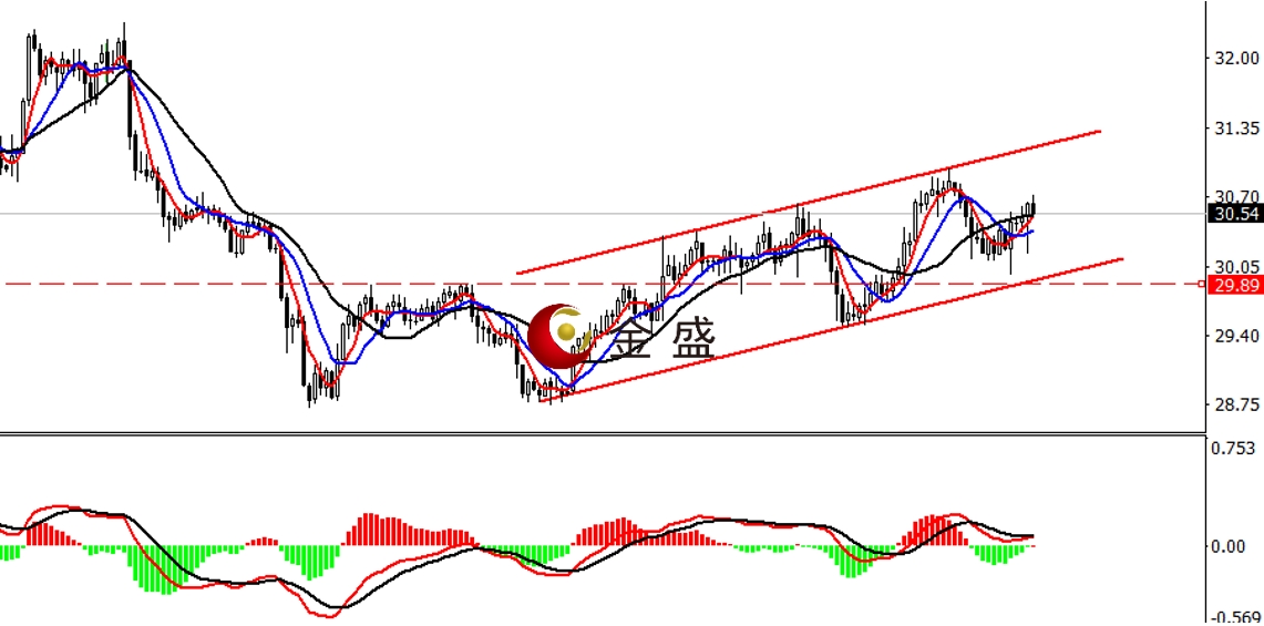 前一个交易日,行情白盘弱势震荡,晚间探底30美元一带强势拉升,最终收涨0.47%。今天白盘行情延续反弹,价格运行在31美元下方。四小时周期,均线系统不断收敛,价格围绕其震荡。MACD指标快慢线在零轴上方有现金叉的迹象,做空的动能衰竭。白银维持反弹走势,价格运行在图示的通道内,昨日回踩通道下轨快速反扑,强化30美元一带的支撑有效。目前随着黄金的不断攀升,白银偏向测试通道上轨的压力。