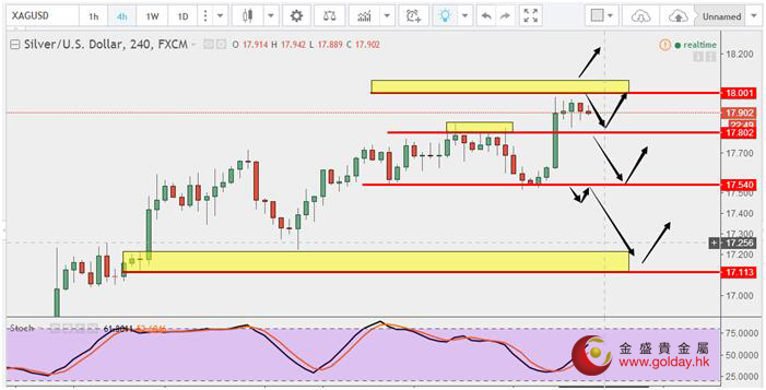 国际现货白银周一(2月13日)亚盘和欧盘小幅回落,基本维持高位震荡,暂时还没有进入偏空格局。上方关注18.00整数关口和18.15美元/盎司附近的阻力,突破则需要观望,不要追多。下方关注17.80和17.60-17.55美元/盎司的支撑,回落获得支撑可以做多。若下破17.54美元/盎司则下方还有空间。